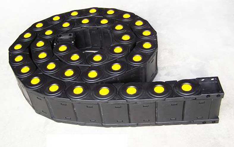 塑料拖鏈由兩個側(cè)鏈連接在一起,頂部和底部通過橋接件連接在一起。