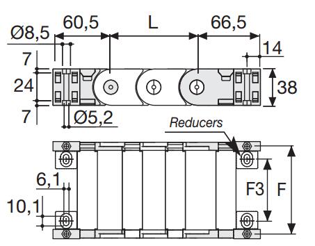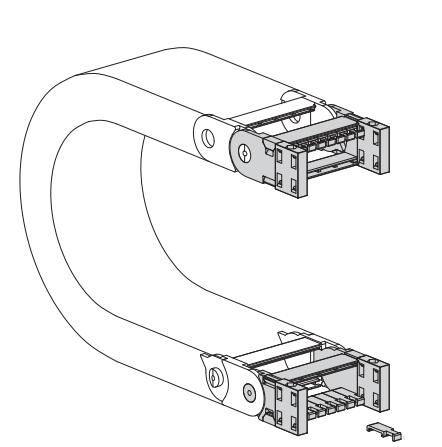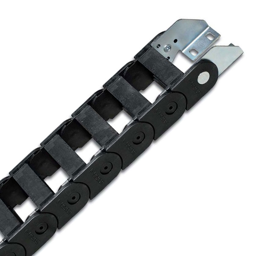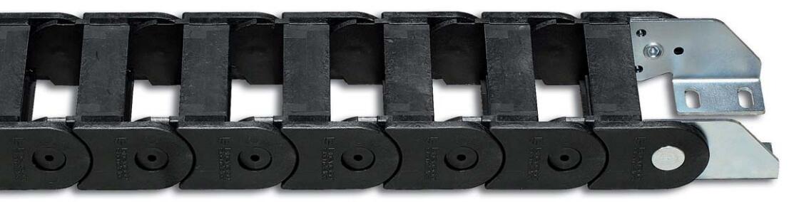內(nèi)部高 (D) 25 mm,尼龍拖鏈帶有大的中心抗磨銷軸的單鏈節(jié)結(jié)構(gòu),同樣抗扭抗拉??梢蕴峁┐怪钡姆指羝?。如果使用導(dǎo)向槽,這種拖鏈特別適合長行程應(yīng)用。