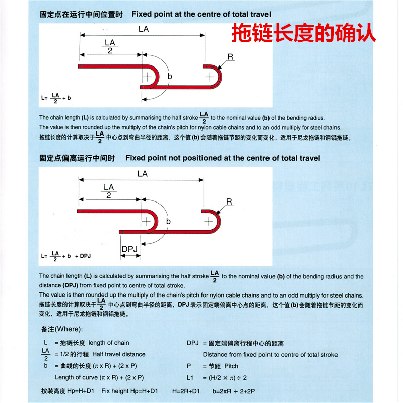 拖鏈長度的計算取決于LA/2中心點到彎曲半徑的距離,DPJ表示固定端偏離中心點的距離,這個值(b)會隨著拖鏈節(jié)距的變化而變化,適用于尼龍拖鏈和鋼鋁拖鏈。