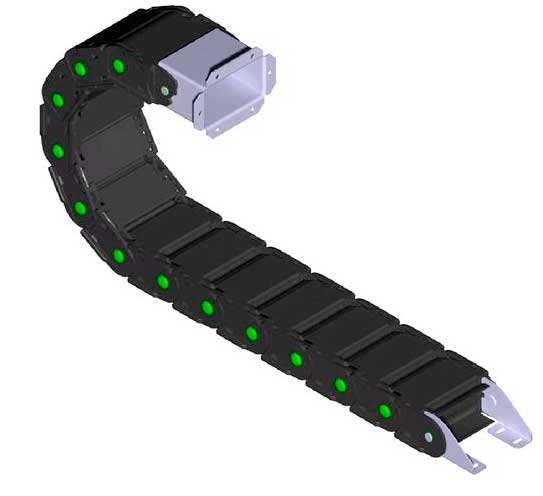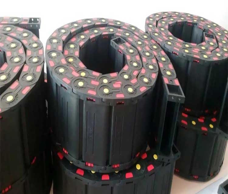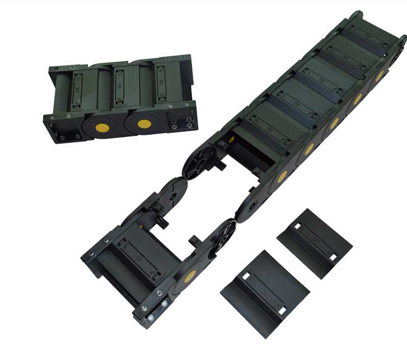塑料拖鏈由兩個側(cè)鏈連接在一起,頂部和底部通過橋接件連接在一起。